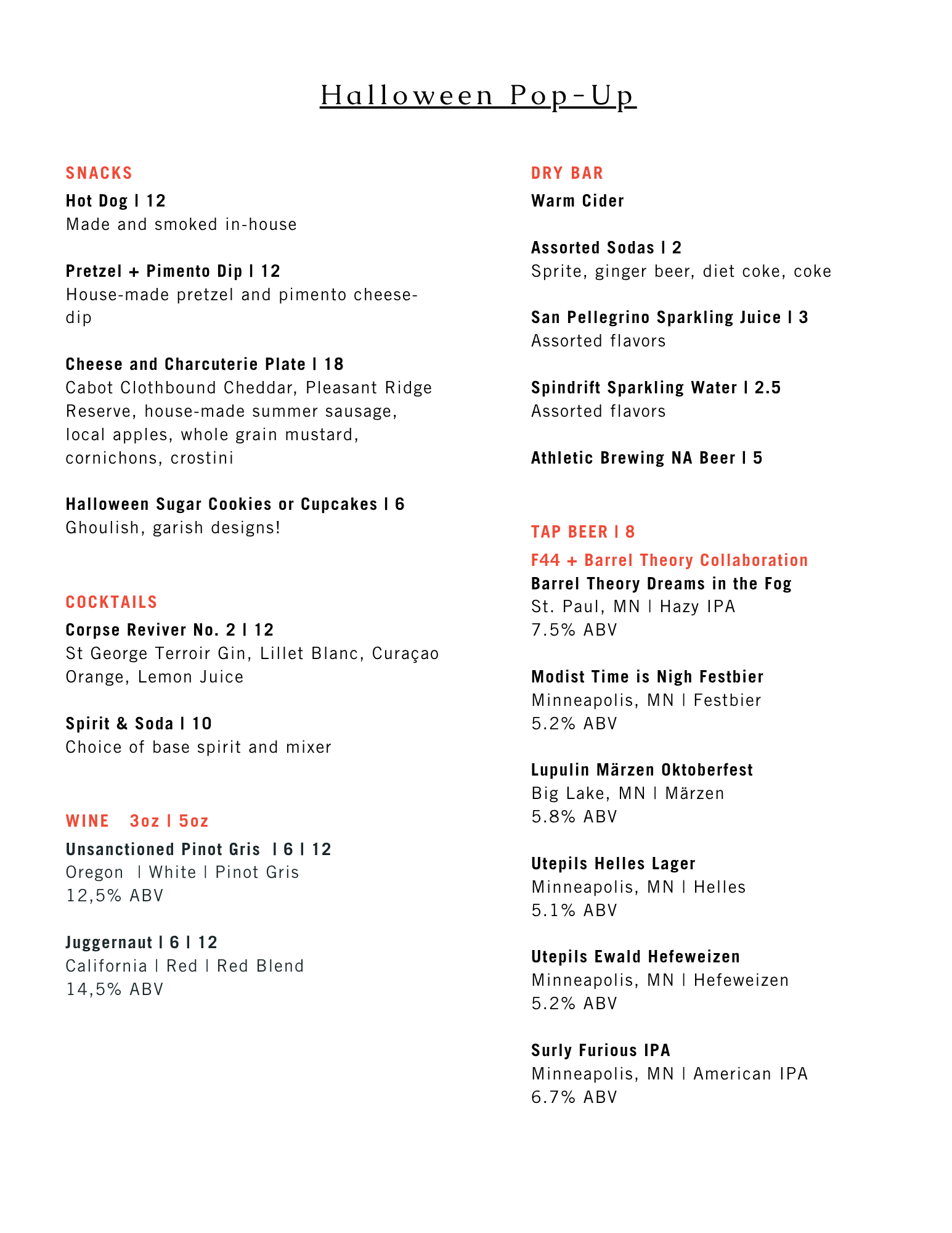 Join us for another SPOOKTACULAR family pop-up while you trick or treat at 44th & France! Each weekend before Halloween, the local businesses at 44 Street & France Avenue host family trick or treating. We'll be playing all the Halloween hits ("Monster Mash" included) in our Events Space, serving up some light snacks like our house-made hot dogs, pretzels with pimento dip, curated beverages, and have some Halloween activities for kids and grown-ups alike. Swing by in your best Halloween costumes, to grab a hotdog and a drink, warm up at our fire pit on the rooftop patio, and spend some quality time with your friends and family!